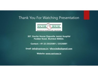 Thank You For Watching Presentation 207, Doctor House Opposite Jaslok Hospital Pedder Road, Mumbai 400026. Contact: +91 22 23525001 / 23526001 Email: info@varicose.in / dhcvcindia@gmail.com Website: www.varicose.in
